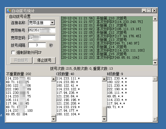 3、打开我们的拨号统计工具,将拨号间隔调至5-10s,点击开始拨号,随着时间的累积,拨号次数的增加,我们就测试出了这个地区IP的大概的IP的AB段的数量,当然这个IP段的AB段是可能发生变化的,因为运营商是可能会随时调整IP段的。测试时间越长,所得到的IP段的准确性越高,大家可以测试下。